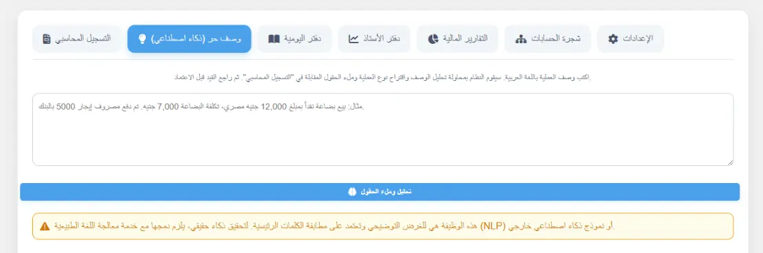 برنامج محاسبة متكامل ( تعليمي) يمكن وصف المعاملة المحاسبية ويقترح عليك القيد المحاسبي (تجريبي)، كما يستكمل باقي الدورة المحاسبية وصولاً للقوائم المالية مع إمكانية ضبط شجرة الحسابات حسب احتياجات مؤسستك.